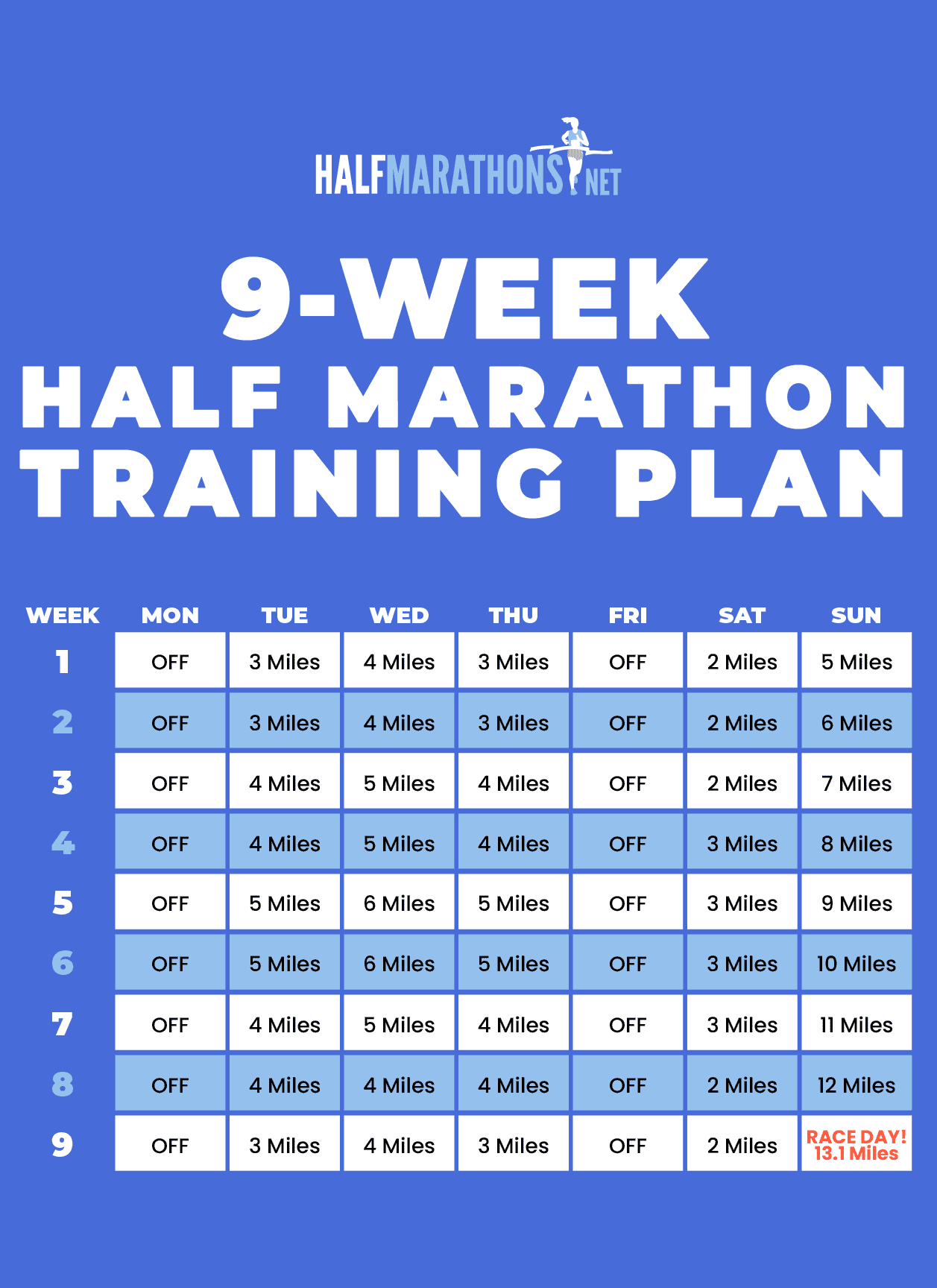 To fool-proof your training, you can use an app like Runna which customizes and builds training plans for your level of fitness. Use code HALF for 2 weeks free.9-Week Half Marathon Training Plan
