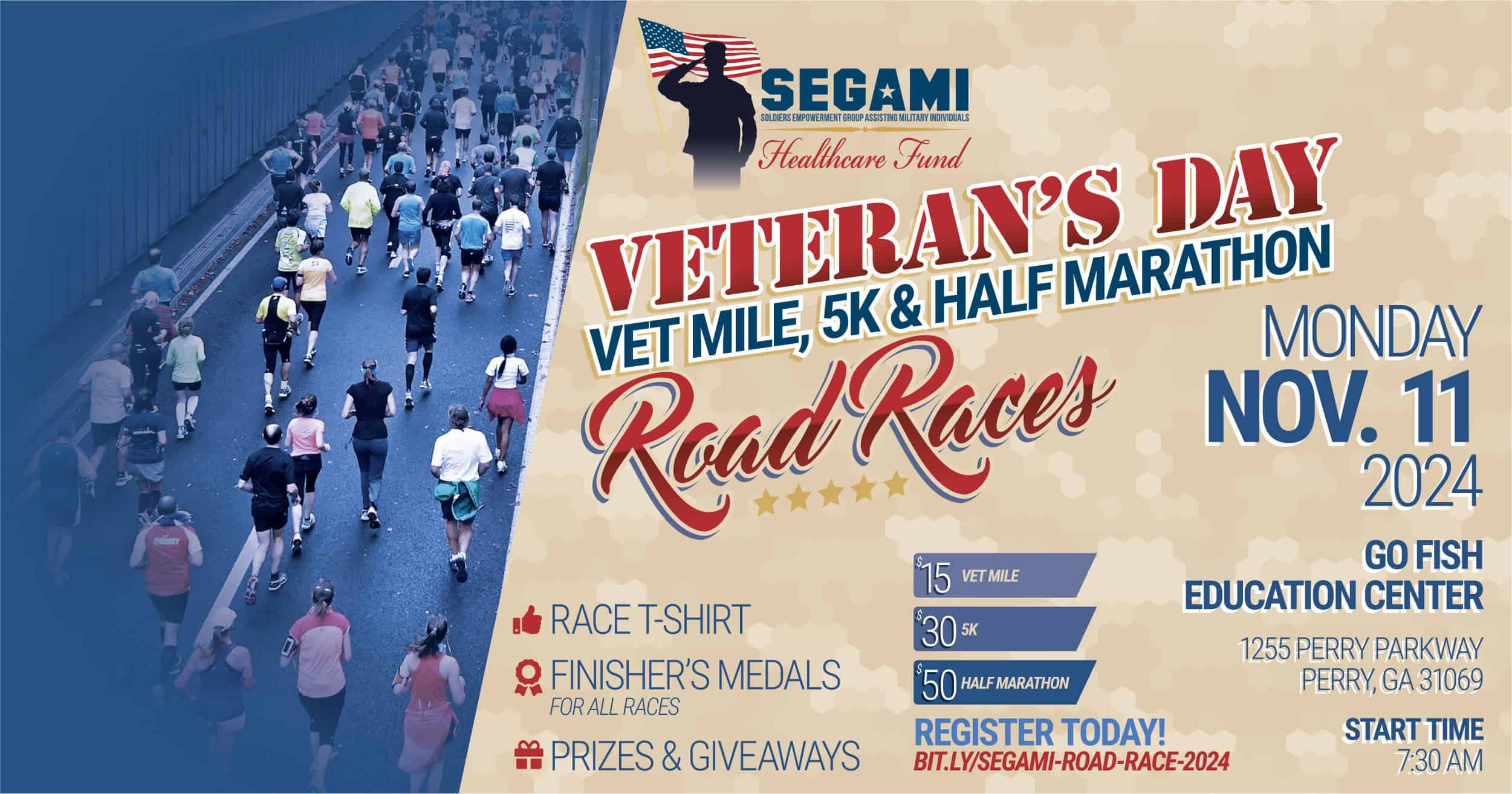 Each Veterans Day, the SEGAMI Half Marathon in Perry, GA brings runners together to honor our nation’s military personnel. Organized by SEGAMI (Soldiers Empowerment Group Assisting Military Individuals), this event supports veterans’ healthcare access and community aid initiatives. Scheduled for Monday, November 11, 2025, and beginning at 7:30 AM EST, the race joins a 5K and veteran-themed mile, forming a patriotic morning of community and tribute .